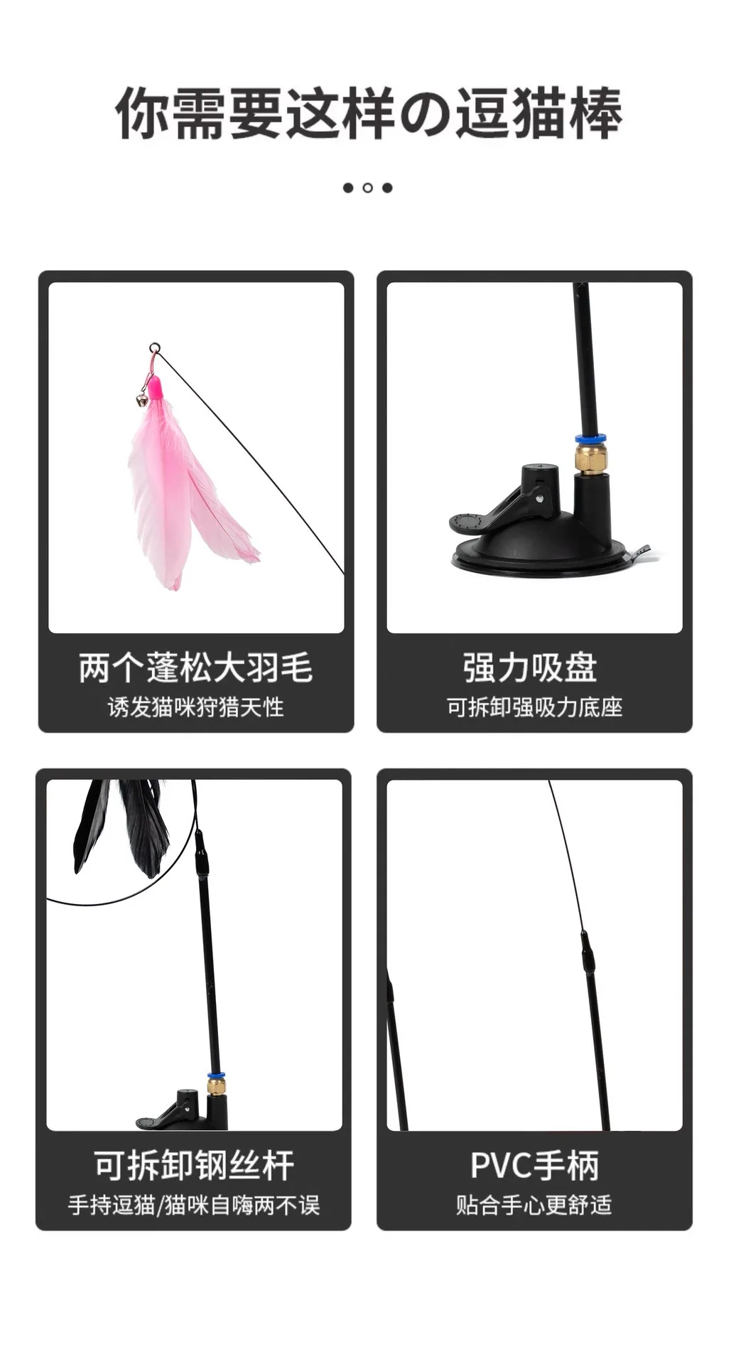 Manual and automatic interactive modes of cat feather toys. By holding the cat wand, you can interact and play with your cats directly. But if you feel tired or busy, you can insert the wand back to the suction cup and let the cat enjoy self-entertainment. Soft and light cat feather toys can excite kittens to exercise and keep healthy, relieve their anxiety and loneliness, which can also enhance relationships with kittens.